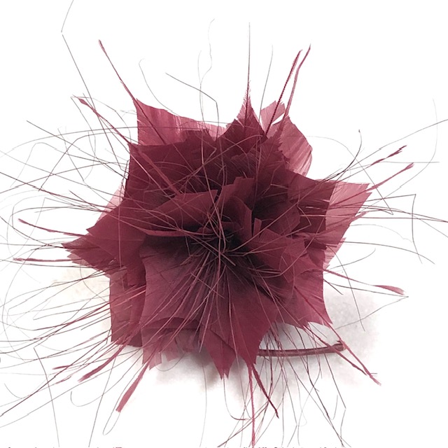 Een middelgrote bloem geheel van bordeaux veren gemaakt. De veren zijn hiervoor geknipt en omgedraaid voor een grafisch effect. Staat fantastisch bij een fascinator!